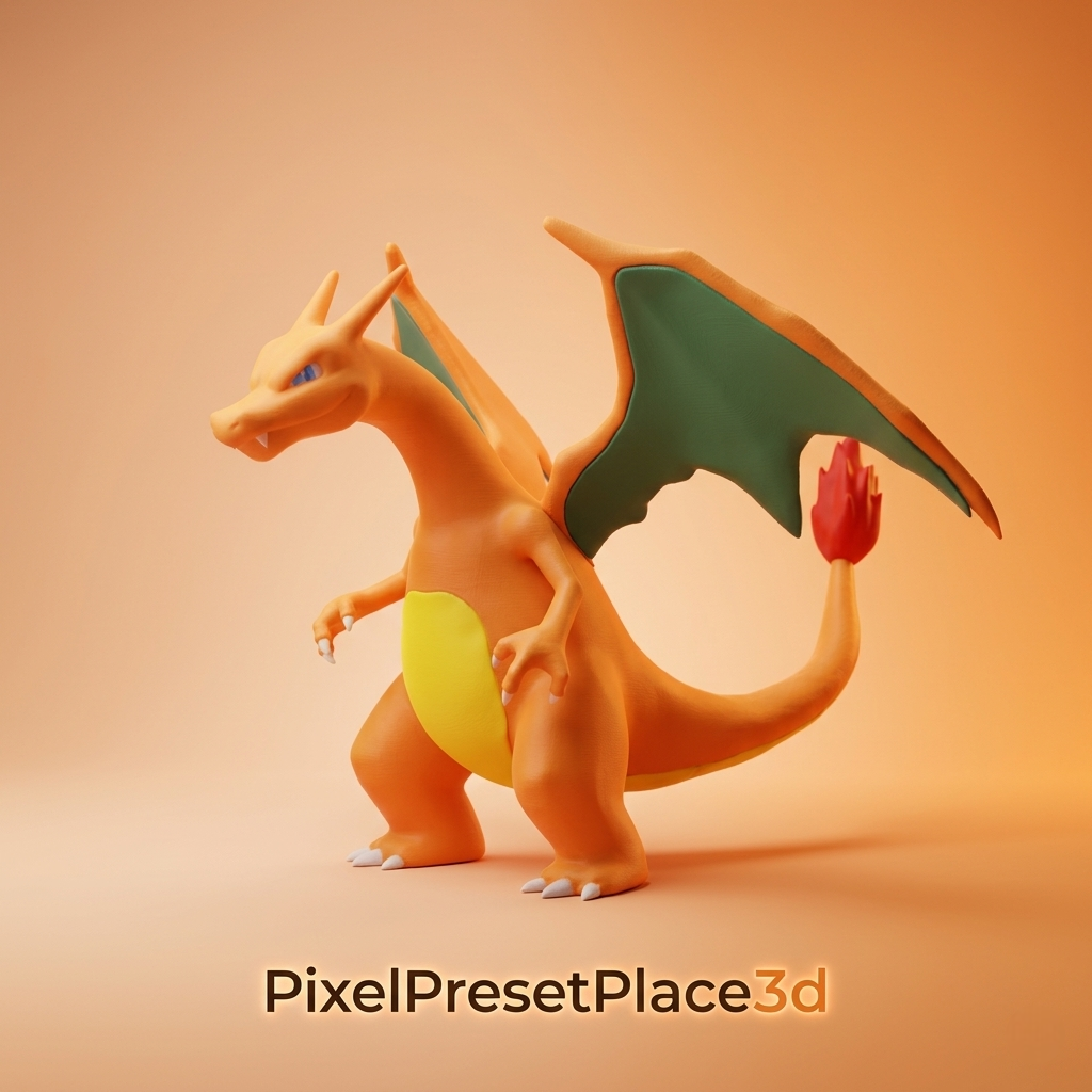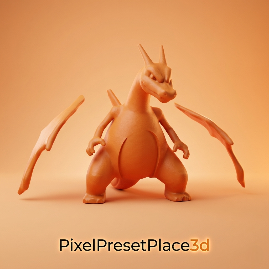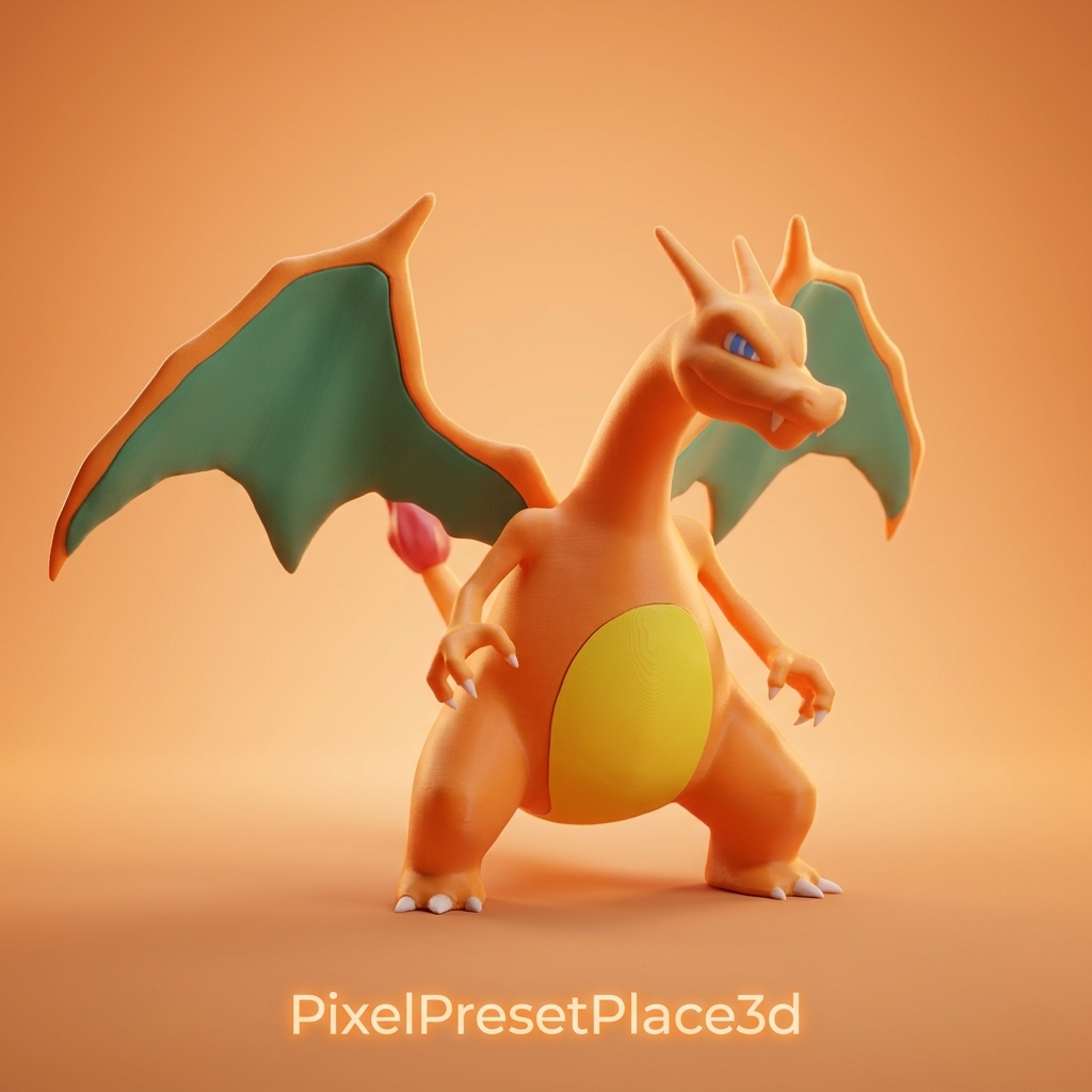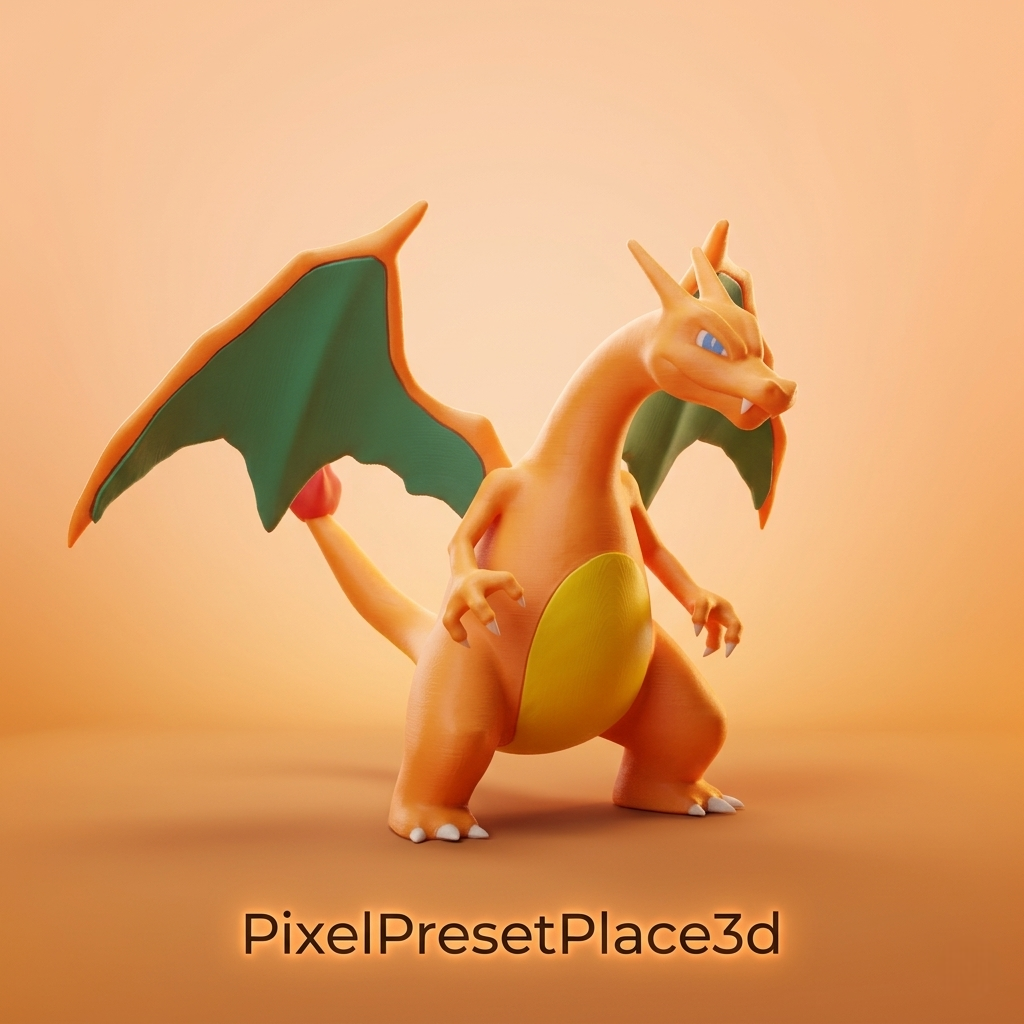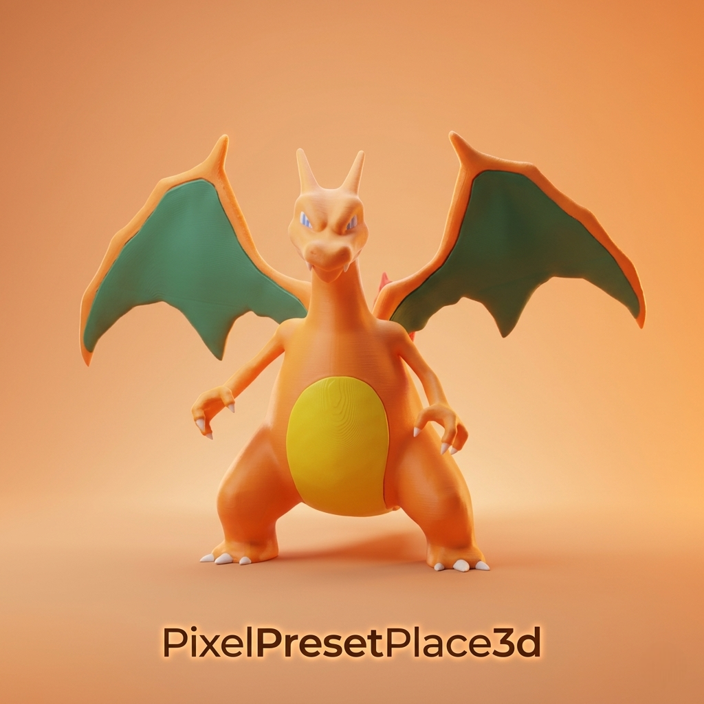 This 3D model represents a fire dragon inspired by Charizard (Pokemon), designed for 3D printing with a very high level of detail for makers and collectors.